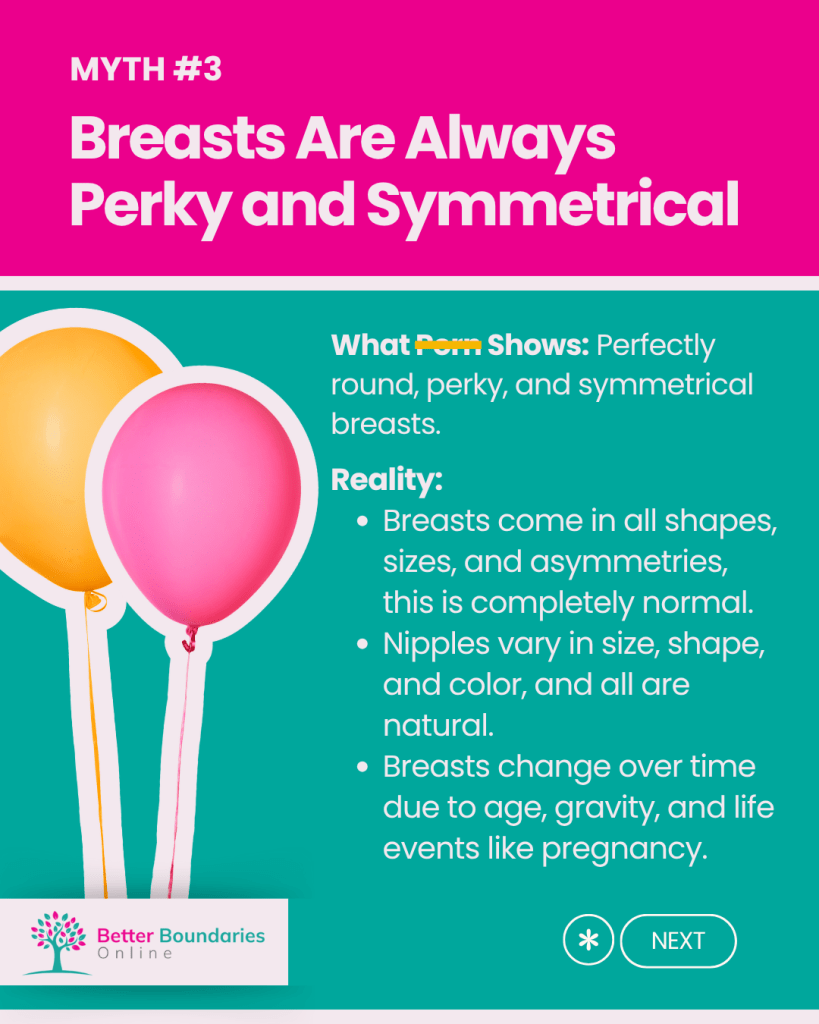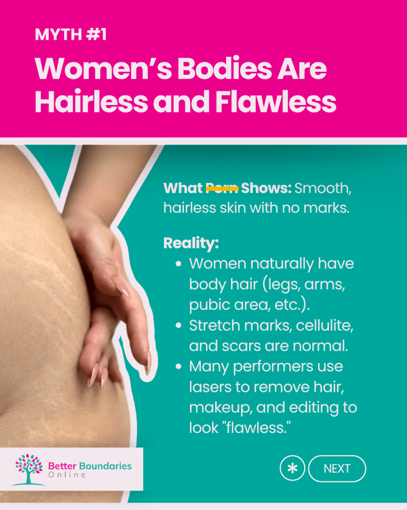 Porn is scripted, edited, and performed for entertainment- not reality. It often promotes unrealistic, exaggerated, and unhealthy expectations about sex, bodies, and relationships, distorting what genuine intimacy and consent look like.